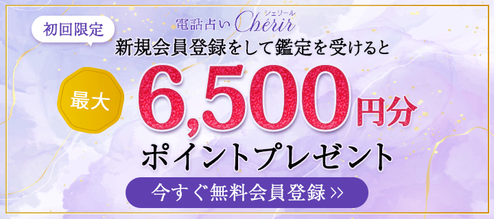電話占いシェリールでは、初回合計最大6,500ptのプレゼントキャンペーンを実施中です。 ※新規登録1,500pt+クレジットカード登録2,000pt+初回鑑定後1000pt+2回目鑑定後1000pt+3回目鑑定後1000pt